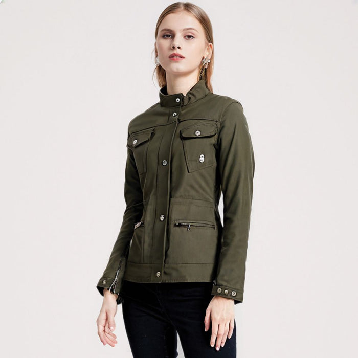 Avec ses boutons pression argentés et ses poches, cette veste est à la fois pratique et élégante.